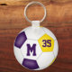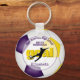 Este chaveiro de futebol feminino com cores roxas e douradas apresenta a palavra "gol" com a silhueta sobre uma jogadora de futebol fêmea chutando uma pequena bola de futebol preto e branco mais o nome personalizável do jogador e o número de camisa e o nome da escola e mascote, tudo sobre um gráfico estilizado de bola de futebol roxo, ouro e branco - por katz_d_zynes
