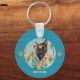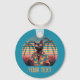 Eterno de Chaveiro Tropical Cat Attitude Round: Um gato preto vestindo óculos de sol de tamanho excessivo e uma camisa havaiana atinge uma pose legal contra um pôr do sol tropical.