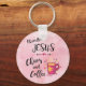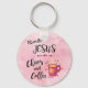 Este é um Chaveiro cristão "Um dos bons"! Ele apresenta a citação cristã cômica "Eu corro em Jesus, caos e café" e uma lata rosa fumegante de café quente... Cercados por Flores e Corações num Fundo de Aquarela Rosa! Design de Arte Gráfica Original do Artista Kerry Miller.