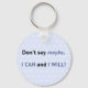 Um chaveiro com texto inspirador que faz um presente de excelente de preenchimento. Pense positivamente e tenha confiança em si mesmo. "Não diga talvez. Eu posso e eu vou!" Texto preto e azul escuro, sobre fundo estrelado azul pálido.