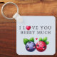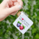 Um design encantador e brincalhão com um doce mirtilo e morango com a mensagem "Eu te amo muito." Perfeito por adicionar um toque doce às suas chaves ou dar a alguém especial. Esta chaveiro adorável é uma maneira divertida e emocionante de mostrar seu amor.