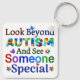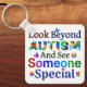 Citação inspiradora de "Olhe além do AUTISM e veja alguém especial" com quebra-cabeça coloridos de autismo para apoiar crianças autistas e suas famílias.