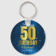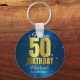 Um maravilhoso chaveiro de 50 anos de efeito azul e ouro. Este design é a forma perfeita de desejar a alguém um "feliz aniversário de 50 anos". Personalize com nosso próprio nome e mensagem personalizados. Tipografia Dourada e branca sobre o universo.