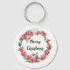 Um chaveiro com uma bonito camada de natal criada com aquarelas. Flores vermelhas e folhas verdes em forma circular com Feliz Natal escrito no centro, em uma moderna moda letra manuscrita.