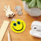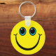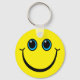 Este chaveiro apresenta um rosto amarelo feliz com olhos azuis.