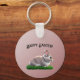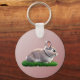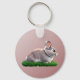 Um belo coelhinho castanho-acinzentado sentado num pedaço de grama verde, junto com as palavras "Felz pascoa!". O chaveiro pode ser personalizado: você pode alterar o texto e carregar sua própria imagem.
