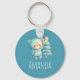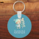 Um chaveiro com uma ilustração adorável. Um urso aconchegante com estrelas e faíscas no pelo. Ao lado de uma árvore de Natal. Cor azul-esverdeada do Pastel. Whimsical e fofo.