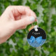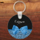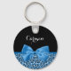 Um chaveiro jaguar preto e azul giro com uma faixa azul brilhante brilhante amarrada em um arco bonito. Personalize esta moda design de impressão animal estilo leopardo acrescentando o nome da sua adolescente. Imagem impressa plana, não arco real.