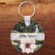 Um elegante chaveiro básico de mármore preto embelezado com um lindo floral rosa. Personalize adicionando seu nome à borda de mármore branca definida em gradiente de ouro falso. Imagem plana, NÃO ouro metálico.