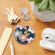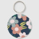 Flores abstrato coloridas florescentes e folhas decorativas em cor rosa, azul, verde e amarela sobre fundo azul marinho