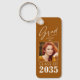 Uma moda, dois novos lados, alumínio resistente, chaveiro de Formando - teclado com sua foto na frente. Todos Personalizados, com "Formando" em um roteiro elegante de tinta com "Classe de, Ano, Nome da Escola e Seu Nome" em tipografia moderna. A foto do formando é acentuada articamente com uma delicada placa de gradiente. O texto e o caimento são brancos, com fundo em cor de ferrugem laranja queimada moderna. Se desejar, edite facilmente a cor de fundo na cor primária da sua escola. A ideia perfeita de presente de graduação para estudantes de segundo grau, faculdade e universidade.