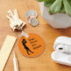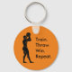 Uma corrente de chave laranja redonda com um gráfico de um jogador de basquetebol a preparar-se para jogar uma bola no estilo Arte Grega com as palavras "Comboio. Jogue. Ganhe. Repita." Definitivamente a fórmula de vitória universal para qualquer desportista.
