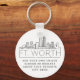 Uma cadeia-chave única representando a bela cidade de Fort Worth, Texas. Este chaveiro apresenta uma ilustração estilizada do horizonte único da cidade com seu nome embaixo. Por baixo do nome da cidade está um lugar para o seu slogan ou afirmação exclusivo sobre a sua cidade favorita.