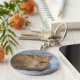 Um chaveiro com uma fotografia da natureza de querido com uma pequena raposa vermelha, toda enrolada em uma bola descansando na neve fria do inverno.
