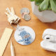 Uma corrente chave com uma fotografia fofa de um pequeno boneco de neve. Lá fora, no inverno, com neve caindo por toda parte. Esta cara bonita está vestida de chapéu azul e cachecol.