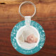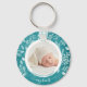 O chaveiro de botão redondo apresenta a sua foto favorita rodeada de folhas brancas, bagas e pontos em um fundo de turquesa texturizado. DICA: Carregue uma foto de alta resolução que mostre seu bebê no meio - você pode ir para um quadrado também. Chaveiros fazem presentes memoráveis para família, avós e amigos ou criam por si mesmos.