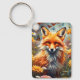 Ein hübscher kleiner Fuchs schaut dich an. Er sitzt zwischen Blumen und spielte mit Schmetterlingen.