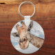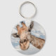 Button Keychaine com a imagem de um retrato de uma girafa engraçada olhando para o espectador perto da câmera.