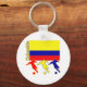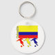 Três jogadores de futebol jogam em frente à bandeira colombiana. O nome do país Colômbia está do lado