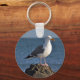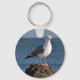 Linda gaivota branca empoleirada na rocha com fundo oceânico