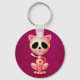 Este adorável design de gatinhos cor-de-rosa é decorado com espirais e padrões ponto. Os pedais das flores circulam os olhos negros puros na tradição do Dia dos crânios de açúcar Mortos. O gato está sentado, olhando para frente com sua cauda acenando ao fundo. A cabeça grande fica sobre um corpo minúsculo que cria uma aparência divertida, como um desenho. Uma estrela de cinco pontos fica no meio da testa do gatinho enquanto um coração vermelho e amarelo brilhante aparece no centro do peito. Uma sombra cai sobre o fazer de fundo rosa vibrante que o design parece flutuar logo acima da superfície deste chaveiro. Este gatinho bonito é um design divertido e na moda inspirado pelas belas padrões do Dia dos Pelos Crânios do Açúcar Morto.