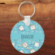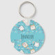 Uma corrente chave com um padrão de gato giro, colocada sobre um fundo azul e decorada com arco-íris e estampas de pata e muito mais.