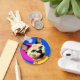 Um close-up de um gato usando uma coleira, enquadrado dentro de um espelho circular contra um fundo colorido, mostrando seus olhos brilhantes e características únicas.