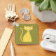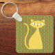 Esta chaveiro divertida apresenta um design ousado retrô inspirado em tons de laranja, verde-oliva e azul com um gato amarelo brilhante. Personalize as costas com o texto escolhido. Excelente para sacos de presentes.
