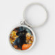 Chaveiro com um adorável gato negro vestindo o chapéu de bruxa! Esta pequena bolinha se posou com uma abóbora. O outono deixa tapete no chão da floresta. Um presente perfeito para as comemorações do Dia das Bruxas!