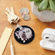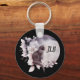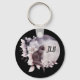 Uma corrente chave com uma pintura aquosa de um gato preto e um buquê floral roxo e rosa claro. Em frente a uma grande lua de cheio. Na moda e mágico.