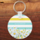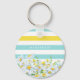 Um chaveiro floral fresco primavera com margaridas bonito amarelas e brancas contra um aqua de tendência e fundo listrado branco com faixa de amarelo-borboleta para adicionar um pop moderno de cor. Personalize este design floral ultra ultra girado adicionando o seu nome.