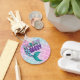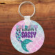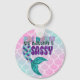 Rapariga e glam Splashy Sassy roxo e verde-brilhante chaveiro de cauda-sereia com uma sereia rosa e turquesa redimensionada para fundo.