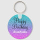 Chaveiro de aniversário feliz personalizado, feminino e vírgula, com um brilhante, colorido, rosa/ azul/ turquesa/ aqua/ lilac/ roxo brilha fundo ombre e elegante escrevendo preto e branco. Você pode adicionar facilmente o nome de sua escolha e alterar a cor e a fonte do nome usando a opção personalizar!