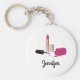 Corrente de chave bonita com um design de estilo de vidro. Batom rosa quente e verniz das unhas. A garrafa de esmalte está aberta, deitada do lado, com gotas de esmalte a sair.