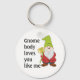 Gnomo de desenho engraçado vestindo um chapéu verde, jaqueta vermelha, calças azuis e botas marrons. Ele está segurando uma flor amarela em sua mão. Para o lado dele em letras negras é um trocadilho engraçado lendo o corpo Gnomo te ama como eu.