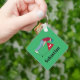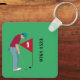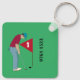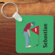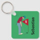 Golfista verde personalizado, vestindo um boné, camisa vermelha profunda e calças azuis, colocando uma bola de golfe em um anel de teclas/ chaveiro. Personalize o texto.