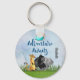 Um chaveiro personalizado que diz que aventura espera. Colocado sobre um fundo de aquarela azul claro. Uma nuvem azul e um sol laranja sentam-se no céu. Um meerkat, gorila e hipopótamo juntos em algumas gramíneas savanas, prestes a embarcar em alguma aventura.