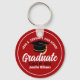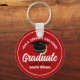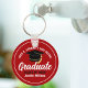 Este chaveiro moderno de graduado sênior personalizado em vermelho e branco apresenta o nome da sua escola ou faculdade para a turma de 2026. Personalize com o ano de sua graduação sob o script manuscrito chique e o chapéu de graduação preto para um presente de chaveiro de graduação personalizado ótimo.