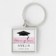 Chaveiro de classe de graduação rosa moderna e simples com nome de formando, nome da escola e boné de formatura preto. Faixa rosa sobre fundo branco. Personalize o chaveiro e faça um presente personalizado de excelente e guarde um formando.