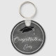 Chaveiro de Graduação de Parabéns de Quadros de Cinza Simples e Modernos com um nome de formando, Parabéns de texto de tipografia branca e boné de formatura de tendência em fundo de quadro de de cinzas escuras. Personalize com seu nome.