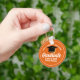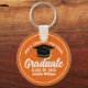 Este chaveiro de formando personalizado moderno, cor de laranja e branco, apresenta o seu segundo grau ou nome de universidade para a classe de 2023. Personalize com o seu ano de graduação com o script de chic manuscrito e o boné de formando preto para um presente de cadeia de chave de graduação personalizada de excelente.