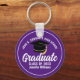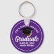 Este chaveiro de formando personalizado roxo e branco moderno apresenta seu segundo grau ou nome de faculdade para a classe de 2023. Personalize com o seu ano de graduação com o script de chic manuscrito e o boné de formando preto para um presente de cadeia de chave de graduação personalizada de excelente.