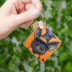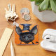 This illustrated design features a wide-eyed black bat in a witch hat and orange bow tie. A delightfully spooky image perfect for Halloween mail or mini art lovers.