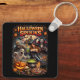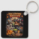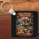 A glamorous witch brews a glowing potion while vampires, ghosts, and ghouls gather around a haunted house on Halloween night.