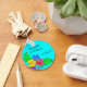 Um favor de casamento chaveiro com flores tropicais havaianas. Use modelos de texto para adicionar os nomes da noiva e do noivo e a data do casamento em texto impresso a preto sobre azul aqua. design de hibisco bonito e colorido com folhas grandes decora este templo tropical a favor dos hóspedes. Comprar em massa para receber descontos.