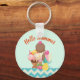 Um chaveiro com o texto: Hello Summer. ilustrado com o desenho de um sundae de sorvete de 3 furos com bordos coloridos. Um cone de sorvete com colheres de chocolate, morango e baunilha. Uma tigela de sorvete neopolita com uma cereja em cima. Morangos e uma fruta de abacaxi sentam ao lado das tigelas. Um padrão de cromo creme e azul ao longo da borda inferior.