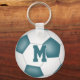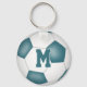 Este teclado de futebol fácil de personalizar apresenta a imagem realista de uma bola de futebol com painéis brancos e teais, sobre a qual você pode personalizar o nome do atleta, número de camisa, nome da equipe e mascote e ano na frente e letra de monograma ou varsidade no verso - por katz_d_zynes