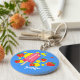 Um chaveiro com um tema de verão. Projetado com picolé cor-de-rosa e alguns morangos vermelhos caindo ao redor do picolé juntamente com alguns plasmas de tinta amarela. Fundo azul. Personalize com um nome.