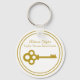 Este chaveiro de corretor de chic é personalizado com sua empresa imobiliária sob o nome do agente de realty na tipografia dourada. Uma bela e antiga chave dourada adiciona um toque clássico a este elegante presente de inauguração de casa.
