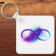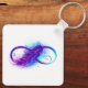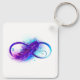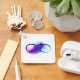 Símbolo infinito com uma bela pena pintada em cores roxas e azuis brilhantes sobre fundo branco.